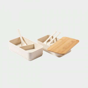 Se trata de una fiambrera con capacidad de 1,4l, elaborada en un material resistente llamado PP veteado que está libre de BPA. Dispone de una tapa de bambú y está dividida en dos compartimentos de 700 ml cada uno. El compartimento interior cuenta con cubiertos, tenedor, cuchara y cuchillo. Además, se incluye una cinta de seguridad exterior para mayor comodidad. Cabe destacar que cuenta con la certificación Food Grade, lo que garantiza la seguridad en el contacto de los alimentos con el material utilizado para fabricar el producto.