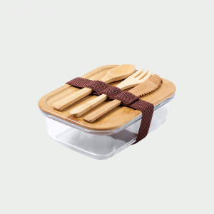 La fiambrera Bejar posee una capacidad de 700 ml y está hecha de cristal. La tapa es de bambú pulido y cuenta con una banda de goma que evita posibles derrames y un rebaje para poder utilizarla como bandeja. Además, se incluye una cinta de seguridad con tenedor, cuchara y cuchillo. La presentación es en una caja individual con diseño eco y resulta muy atractiva. Todo esto en un producto de calidad.